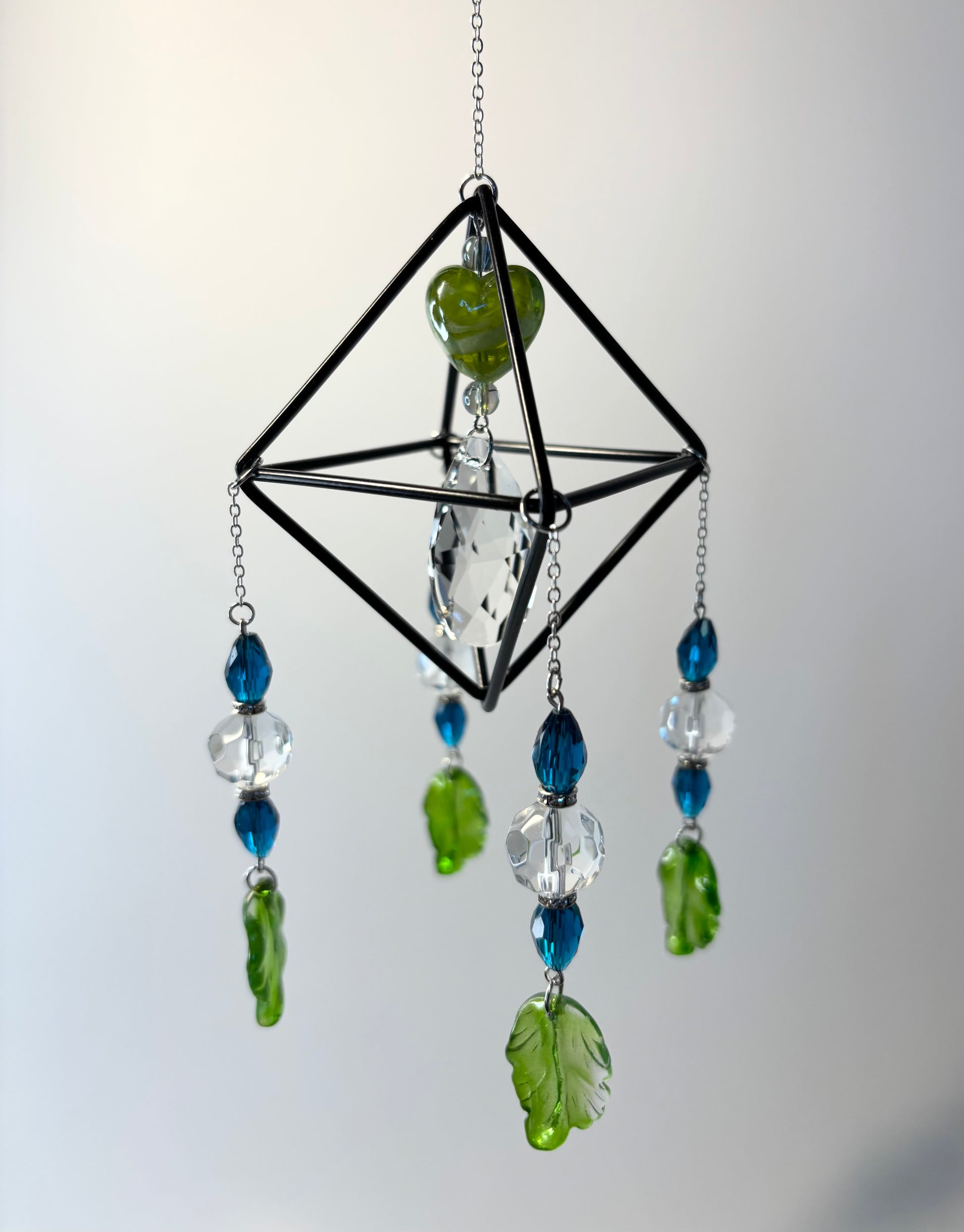 Black geometric frame with 4 pendants, green glass heart, blue, clear & green glass beads, 1 inch x 1.5 inch teardrop crystal prism, silver chain & silver metal accent pieces. 2.5 inches wide, 6 inches high, plus 3 inch hanging chain.