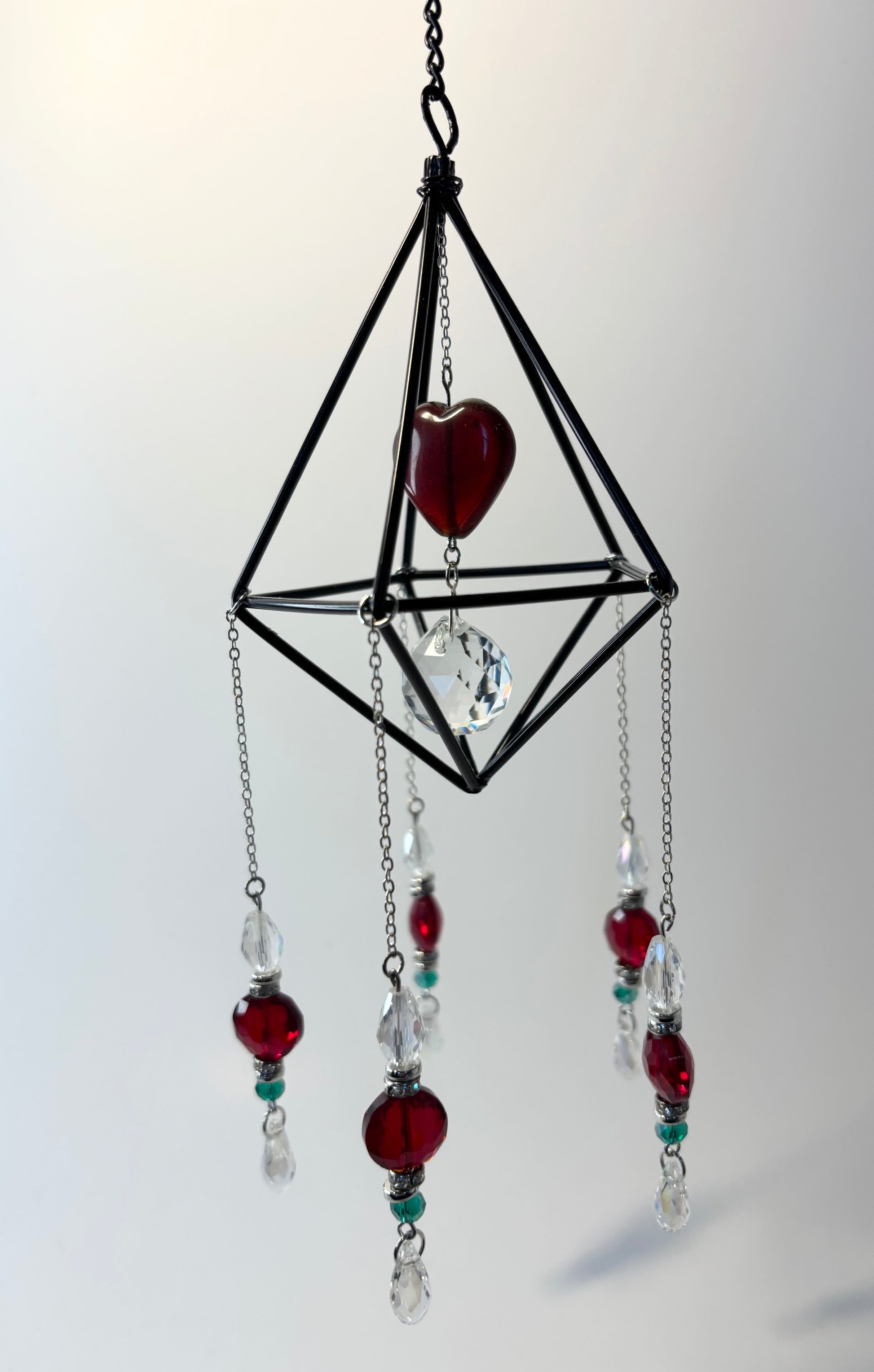 Black geometric frame, 5 hanging pendants with large red glass heart, red, green & clear glass beads, 20mm crystal prism, silver & black chain & silver metal accent pieces. 3 inches wide, 8 inches high, plus 6 inch hanging chain.