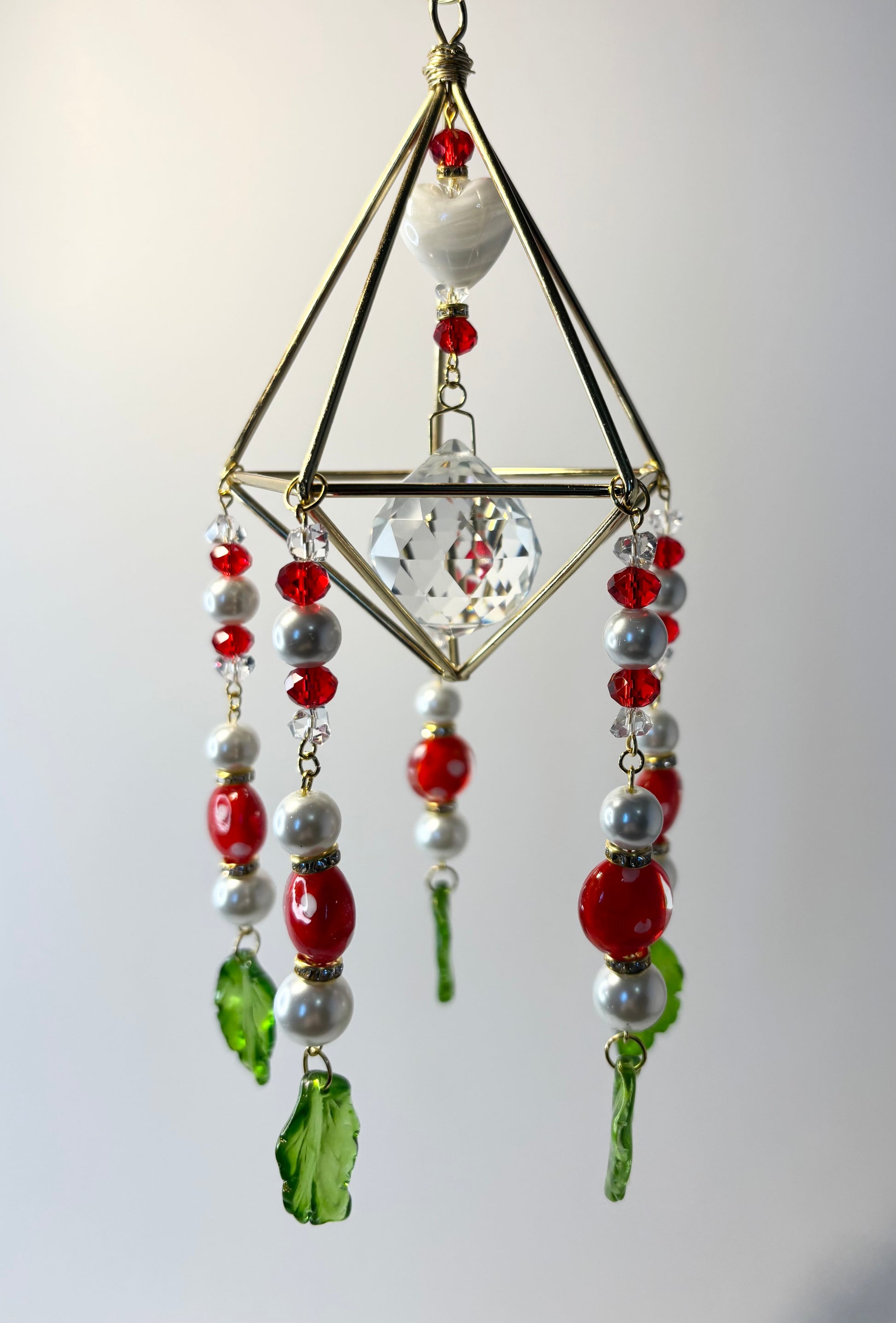 Gold geometric frame, 5 hanging pendants with white glass heart, large pearl, red, clear & green glass beads, 30mm crystal prism, gold chain & gold metal accent pieces. 3.5 inches wide, 8 inches high, plus 6 inch hanging chain.