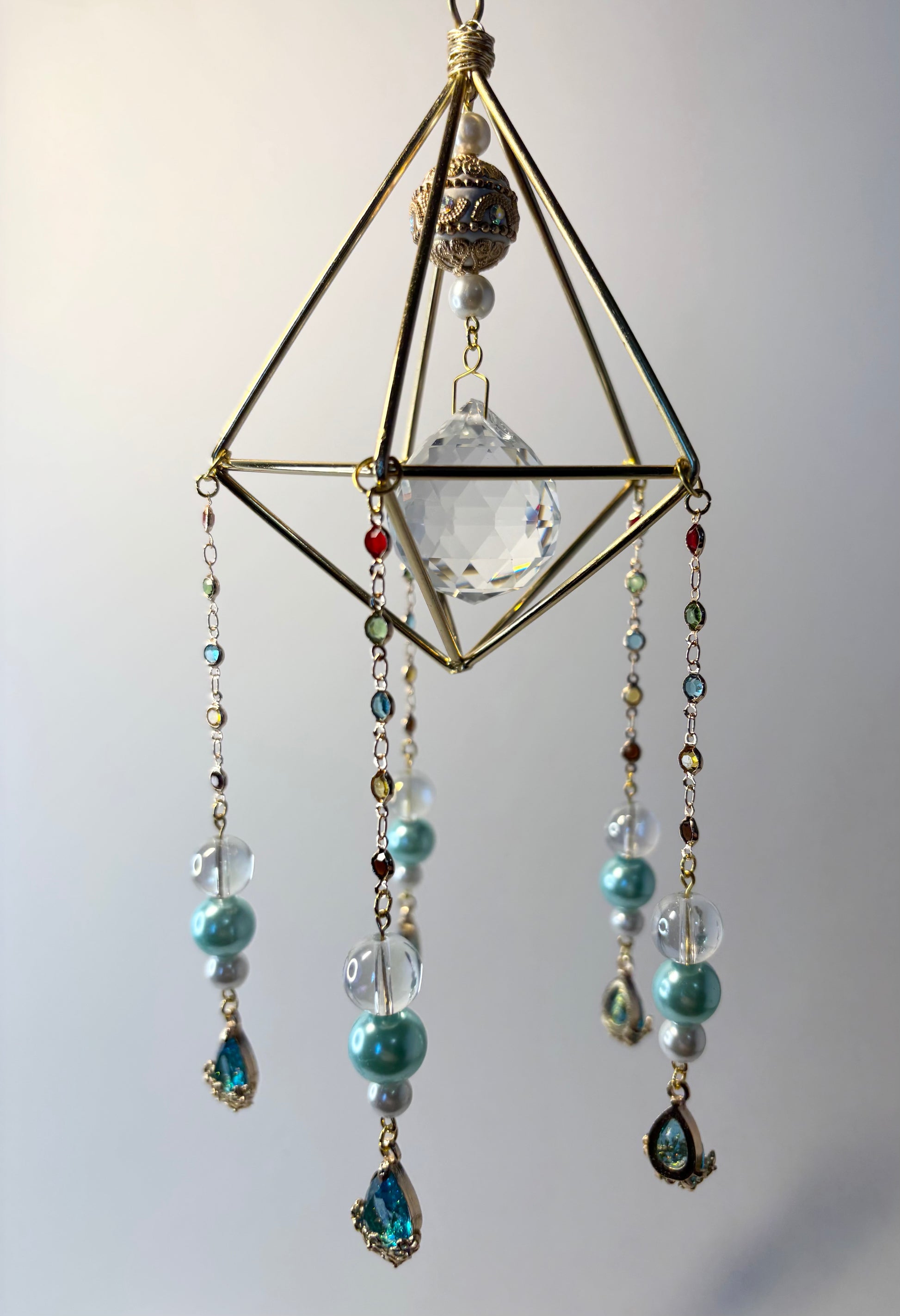 Gold geometric frame, 5 hanging pendants with pearl teal & clear glass beads, 30mm crystal prism, gold jeweled chain & gold metal accent pieces. 3.25 inches wide, 8 inches high, plus 6 inch hanging chain.