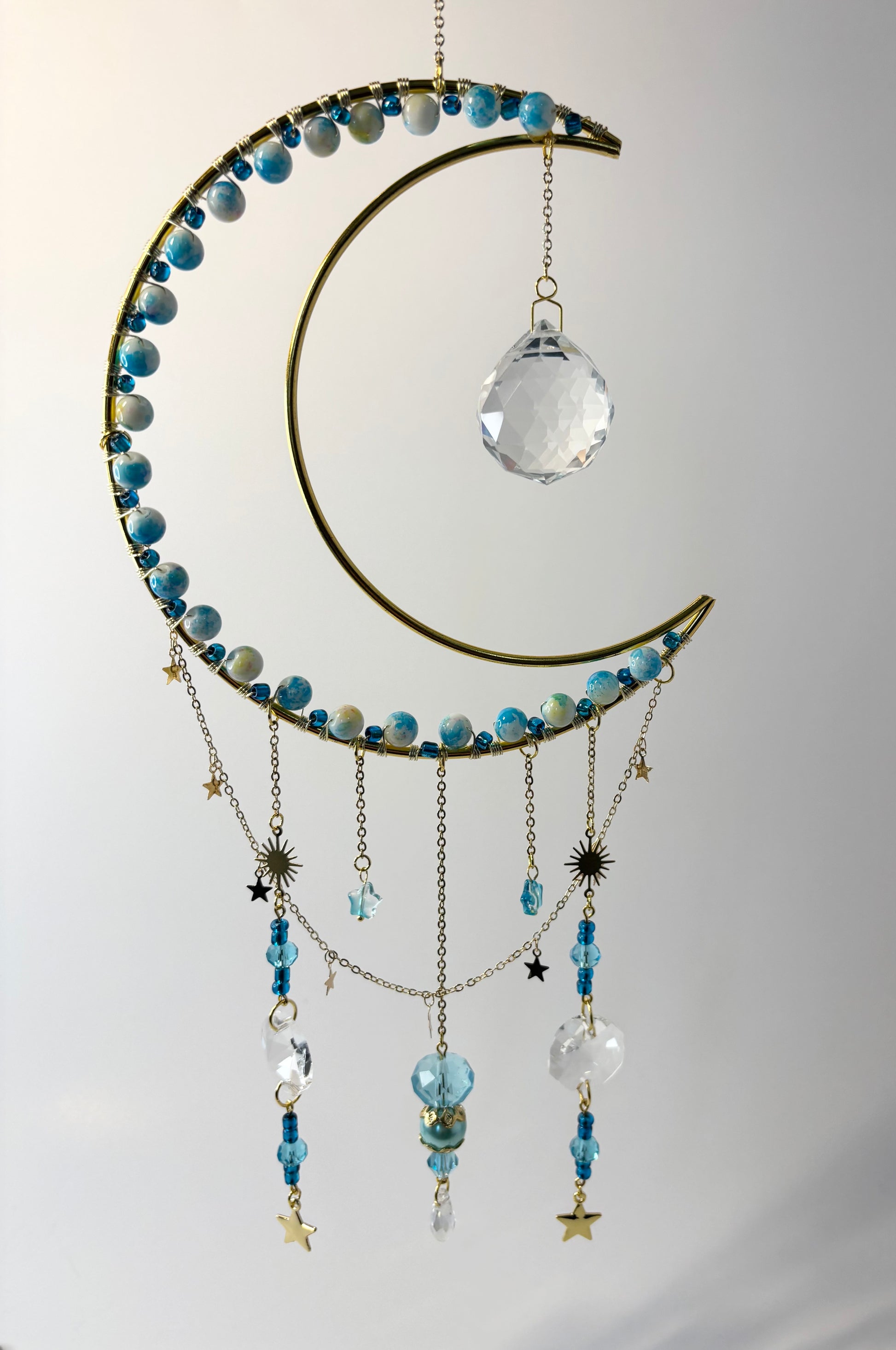 Large gold metal moon frame with light pearl teal, white & clear glass beads, 30mm crystal prism, star chain, gold chain & gold metal accent pieces. 5.75 inches wide, 11 inches high, plus 4 inch hanging chain.