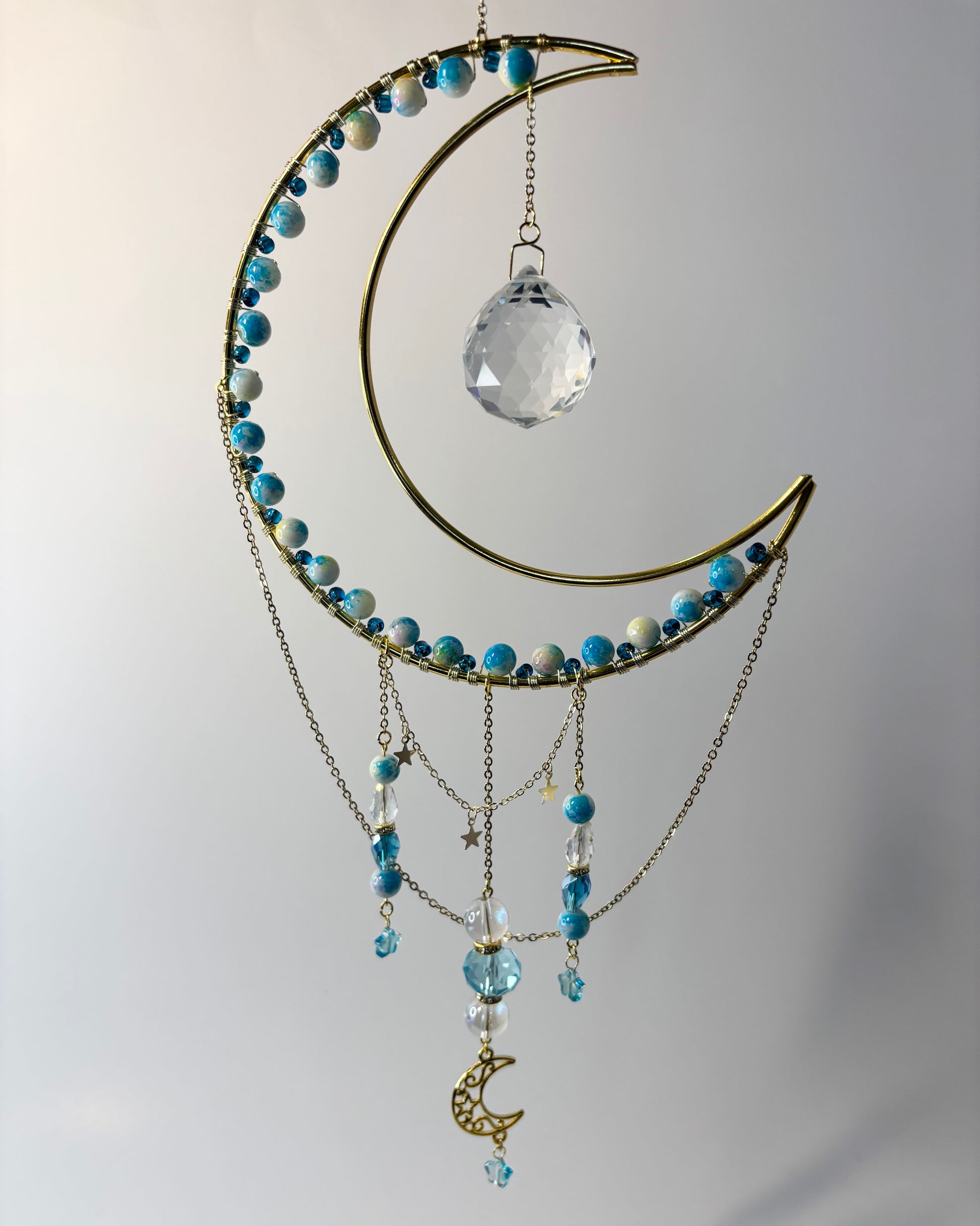 Large gold metal moon frame with teal, white & clear glass beads, 30mm crystal prism, star chain, gold chain & gold metal accent pieces. 5.75 inches wide, 11.5 inches high, plus 3 inch hanging chain.