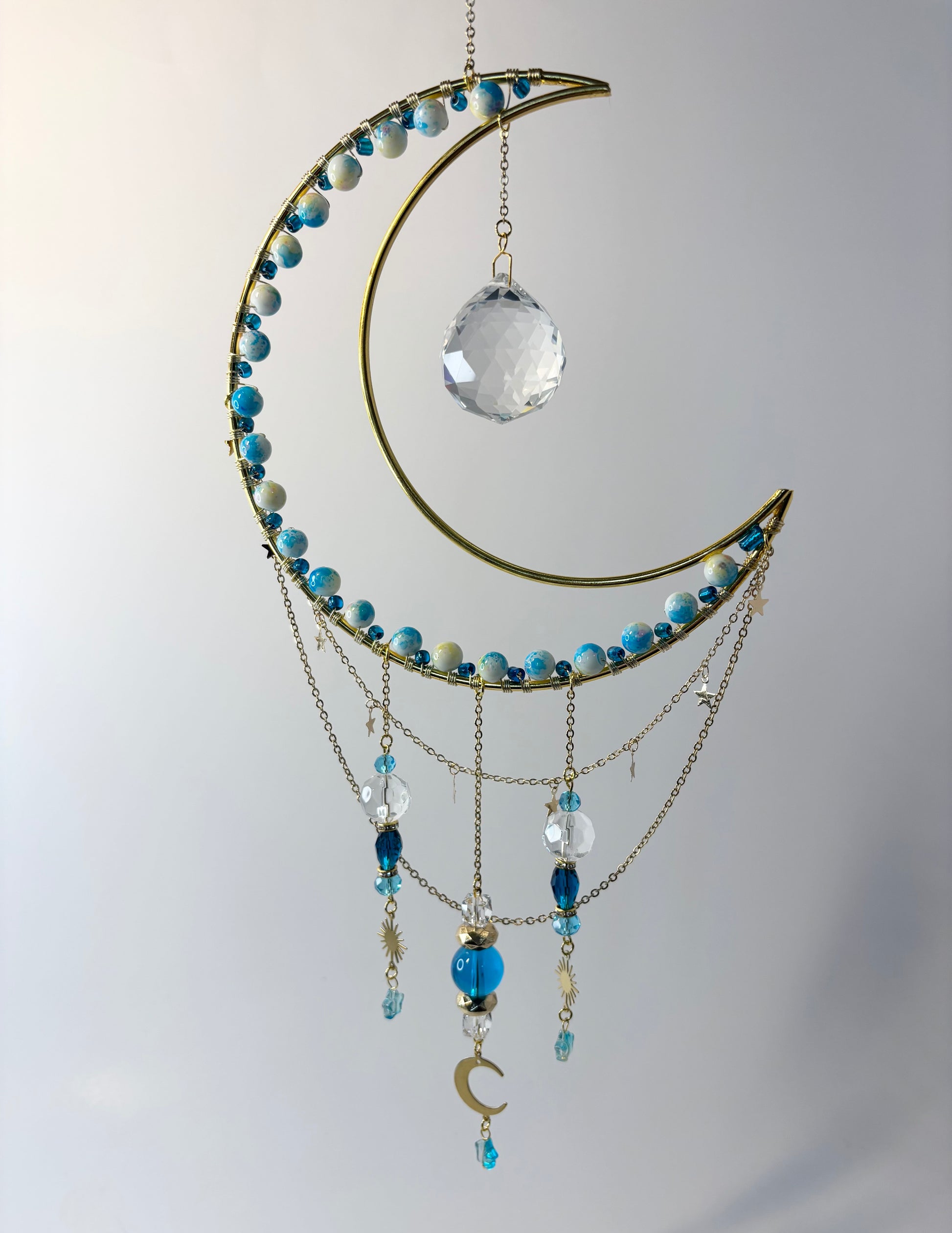 Large gold metal moon frame with dark teal, white & clear glass beads, 30mm crystal prism, star chain, gold chain & gold metal accent pieces. 5.75 inches wide, 11.5 inches high, plus 3 inch hanging chain.