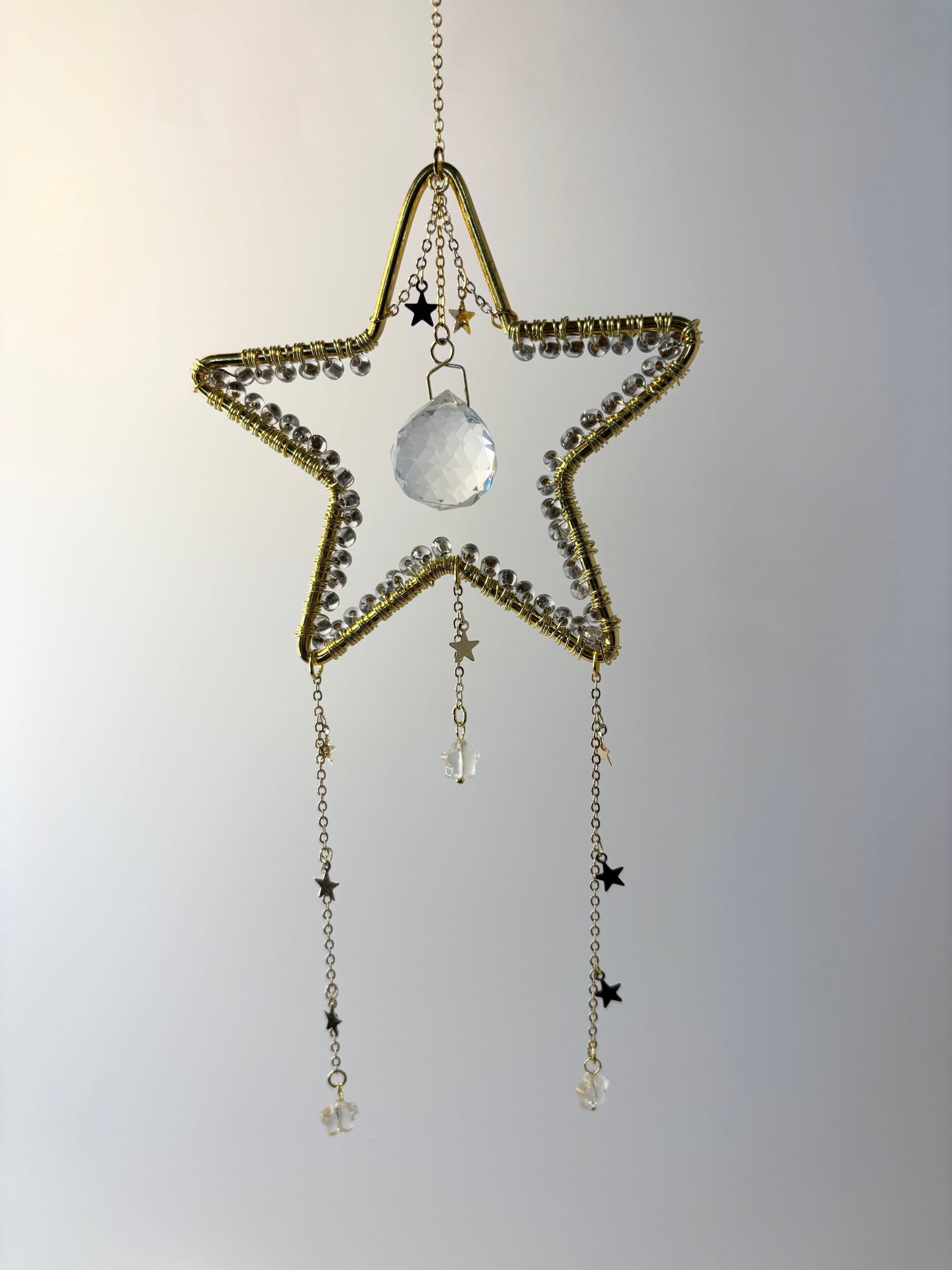 Gold metal star frame with clear glass beads, 20 mm crystal prism, star chain & gold metal accent pieces. 4 inches wide, 7-3/4 inches high, plus 3 inch hanging chain.