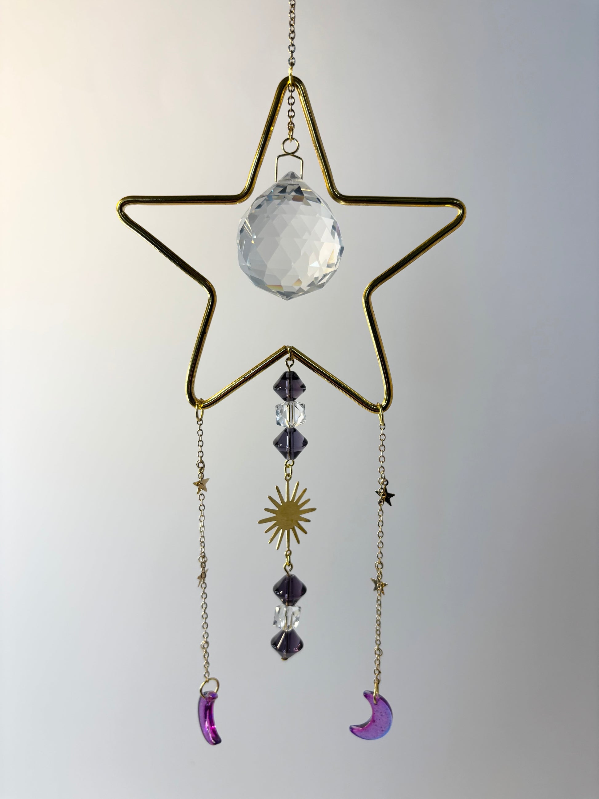 Gold medium metal star frame with purple & clear glass beads, 30 mm crystal prism, star chain & gold metal accent pieces. 4 inches wide, 8 inches high, plus 3 inch hanging chain.