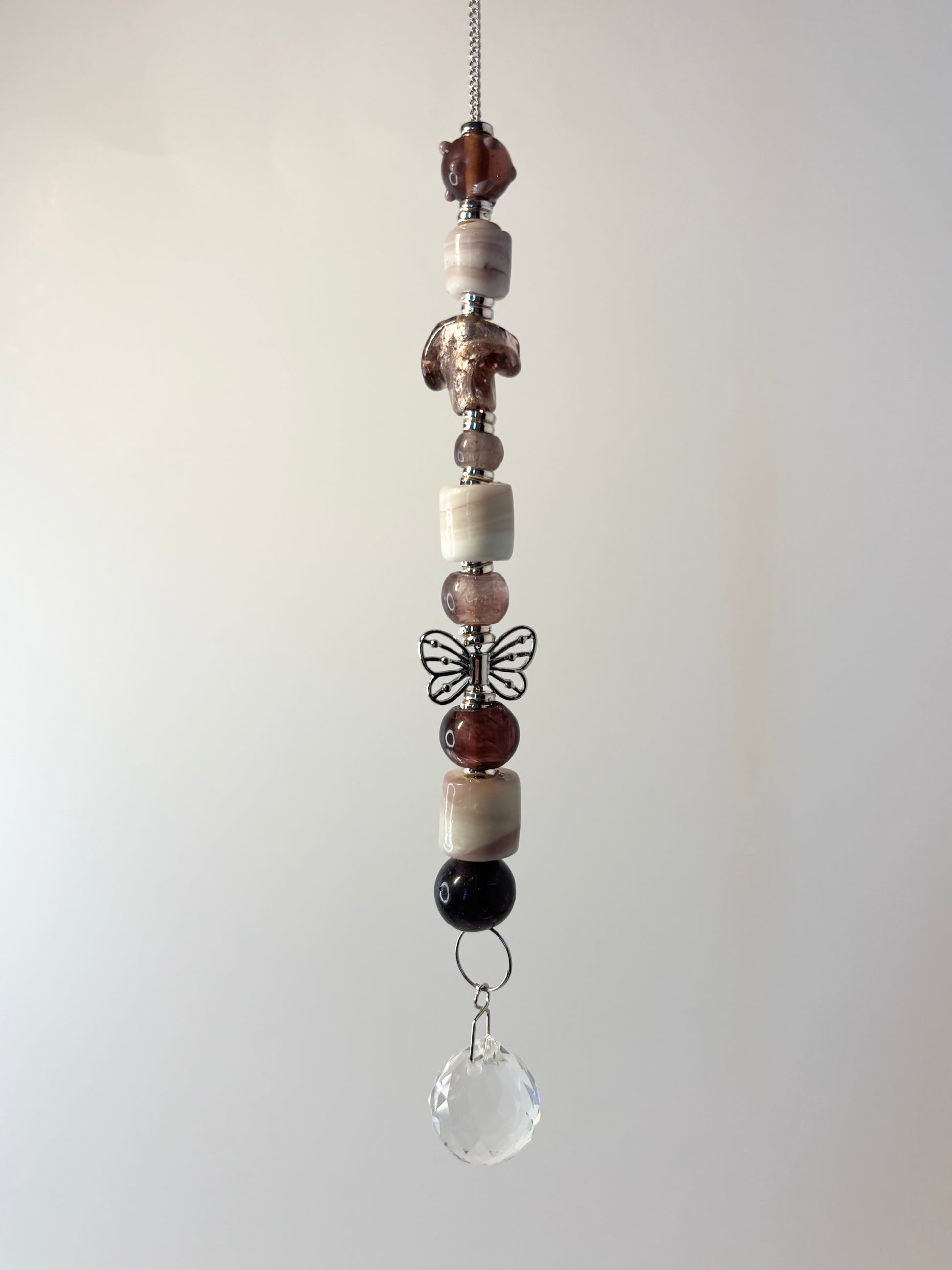 Single strand with mixed purple & white beads, 20mm crystal prism, silver metal butterfly & accent pieces on silver chain. 9.75 inches long.