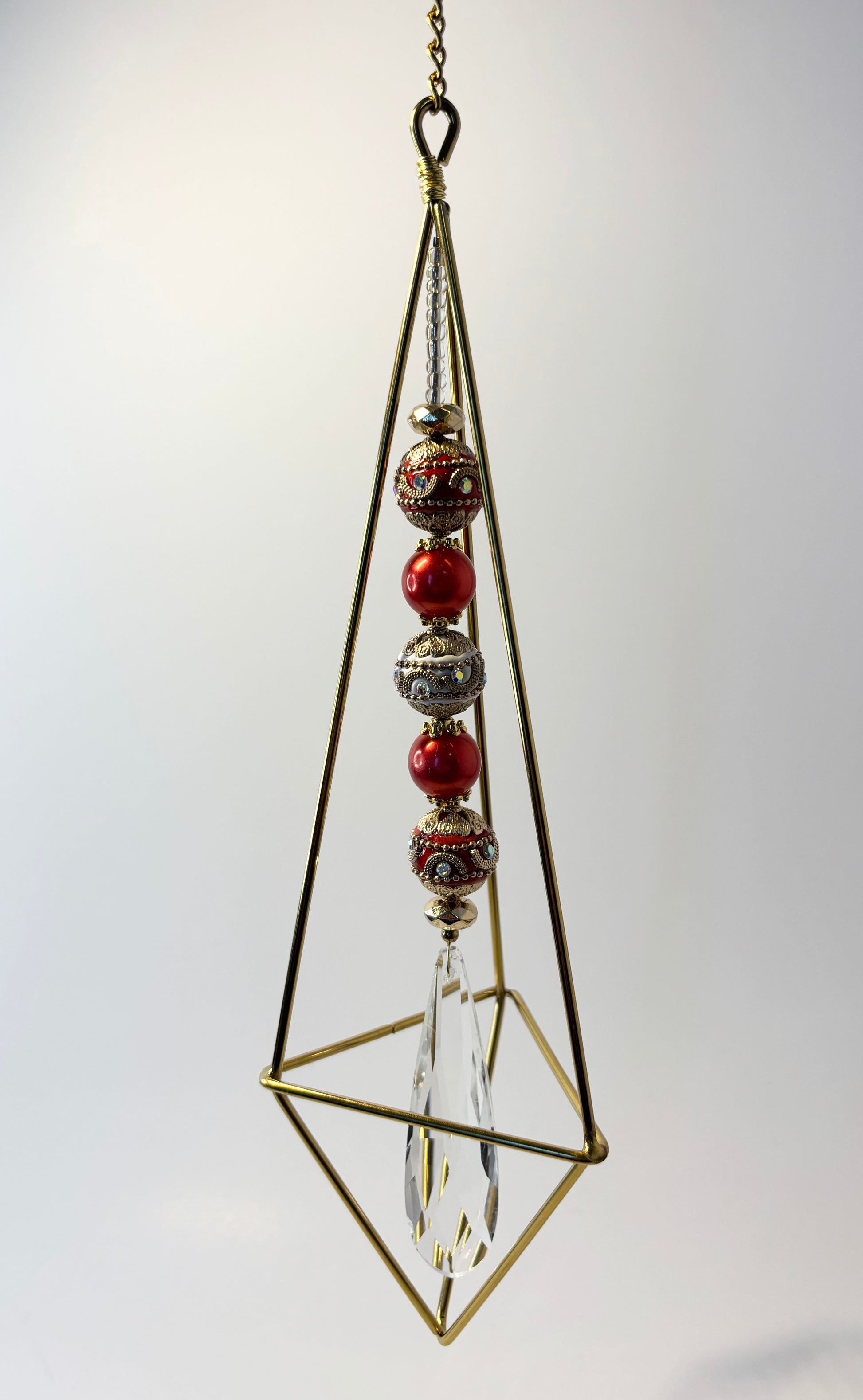 Tall gold geometric metal frame with center hanging pendant, 3/4 x 3 inch crystal drop prism, red & cream beads & gold metal accent pieces. 3 inches wide, 10.5 inches high, plus 7 inch hanging chain.